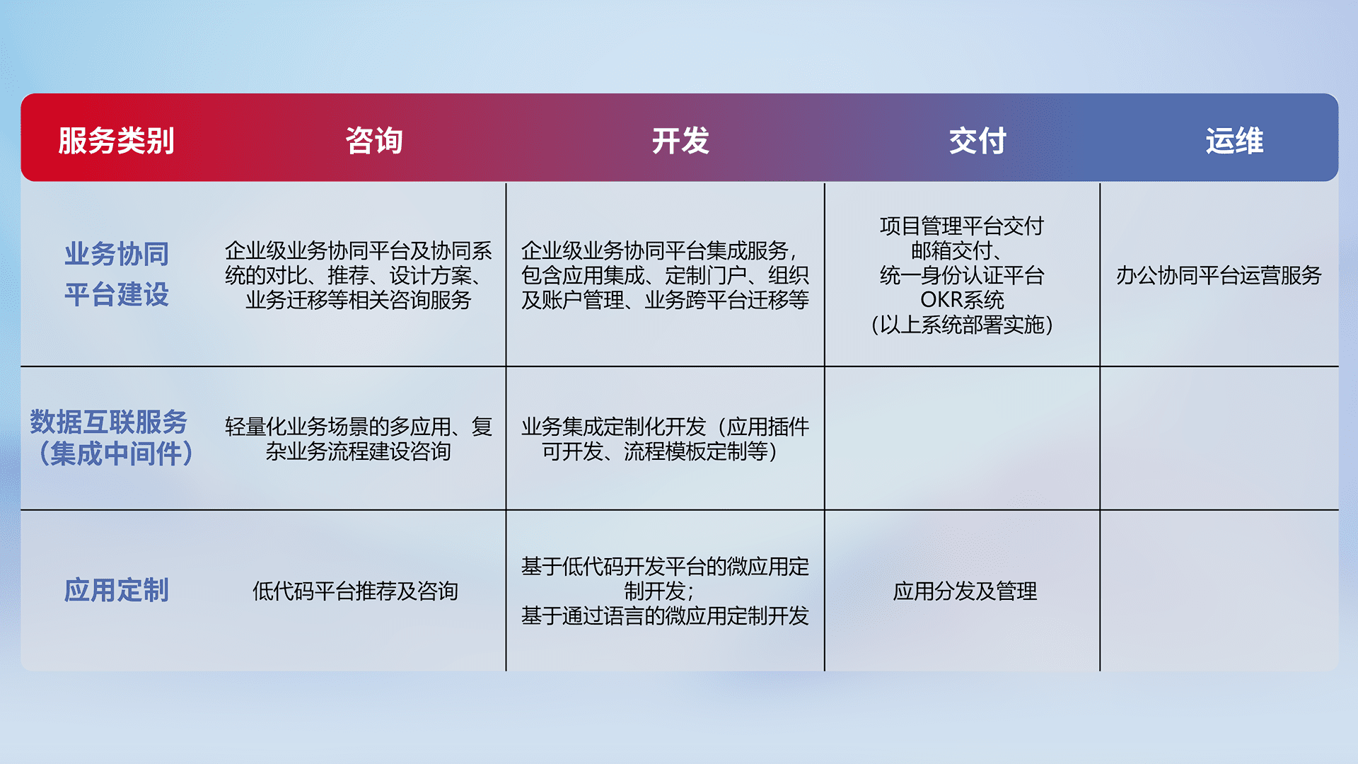 针对钉钉、、企微、、、IDaas等平台级产品提供产品的规划、、方案、、、交付、、、、定制化开发等服务,,,实现如统一协同办公、、智能客户服务、、、混合会议管理、、、、智能数据查询、、、、等业务场景,,实现数字化转型。。