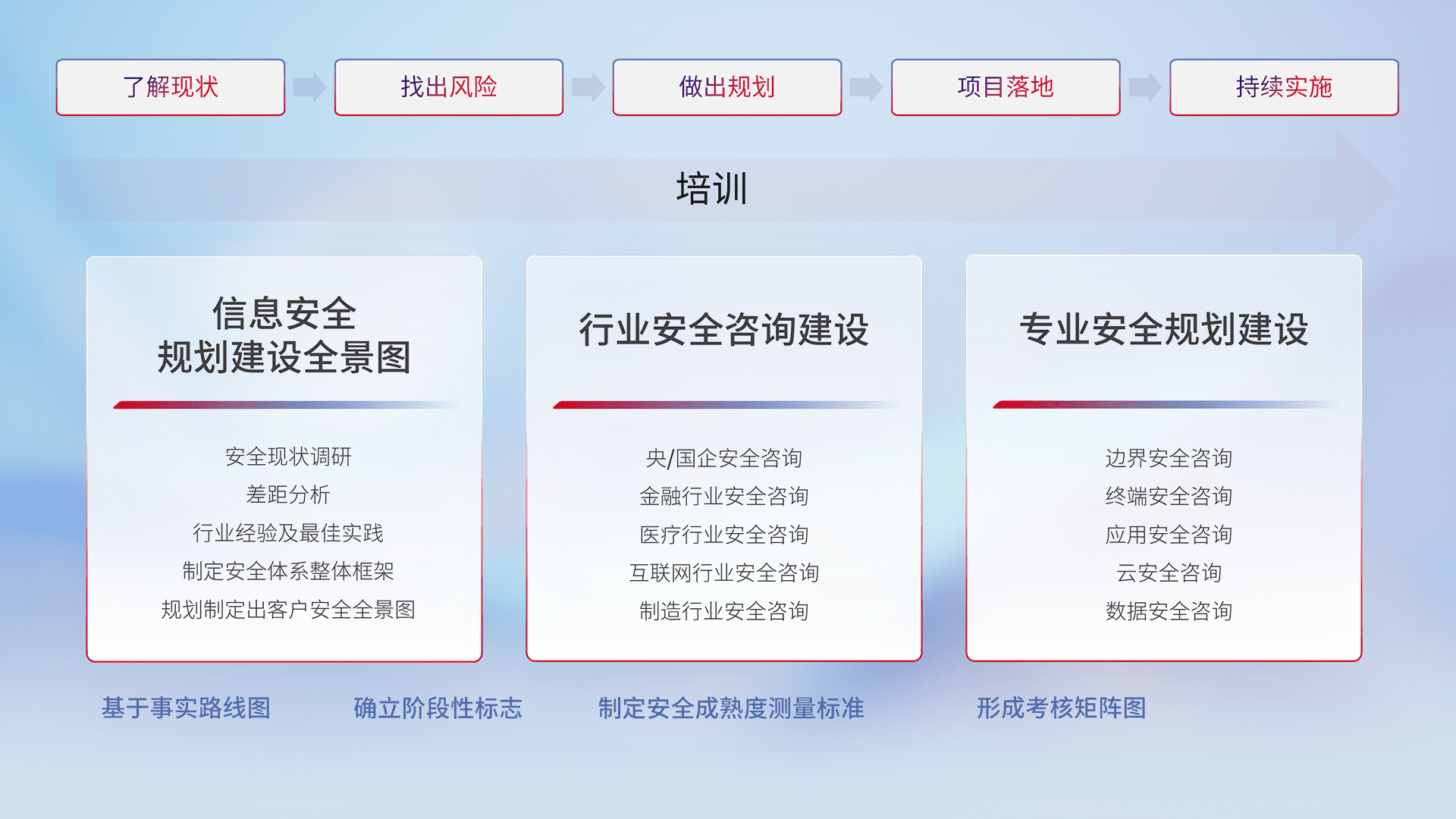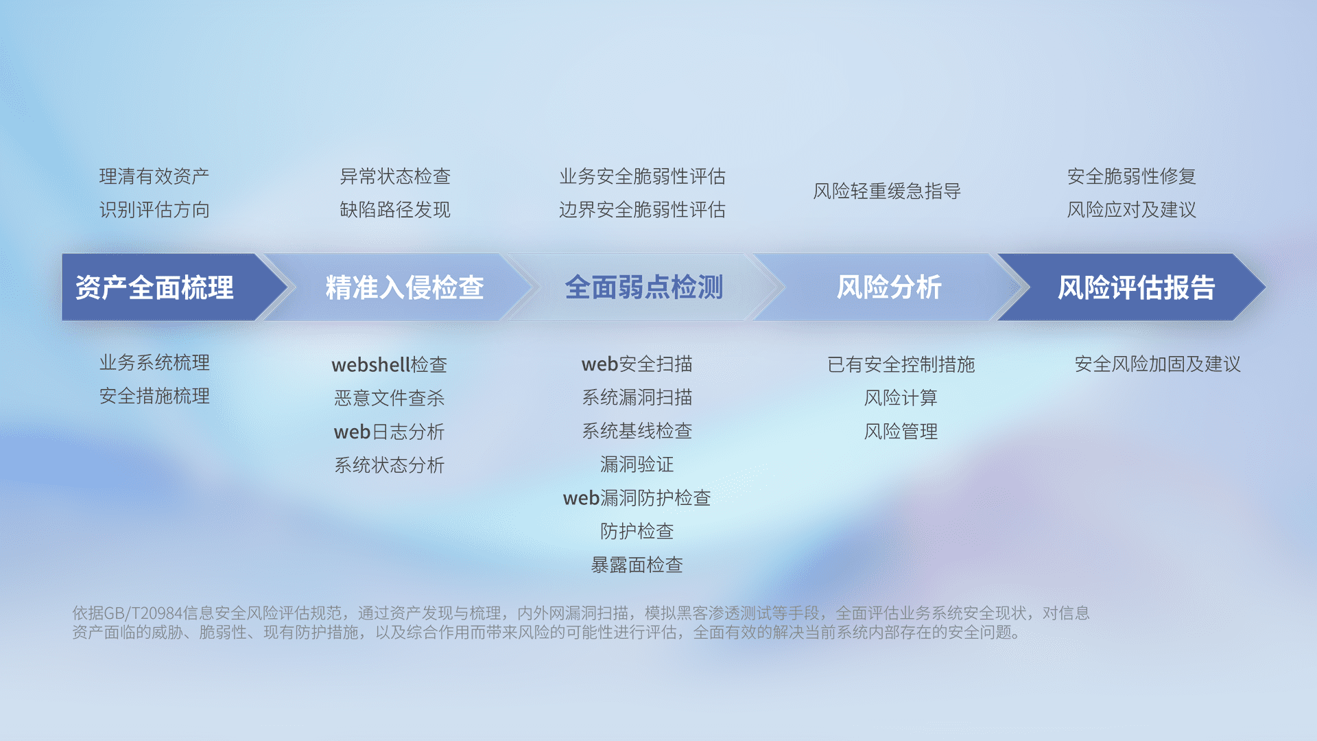 针对客户行业特性,,,以专业的安全服务+多厂商联合解决方案提供专属的一站式安全管理服务,,帮助客户全面感知网络空间威胁,,基于识别、、检测、、、分析、、、、防护、、监测、、、、响应的服务理论模型,,从方案咨询、、、、集成交付、、、评估验证、、优化加固、、、、运维运营,,,致力于为客户提供完整的闭环管理式安全服务。。。。以实战经验为客户打造高抵御风险的安全体系,,,,帮助客户发现威胁、、、、对抗威胁、、处置威胁,,不断积累安全对抗能力,,,持续保障数字化安全。。。